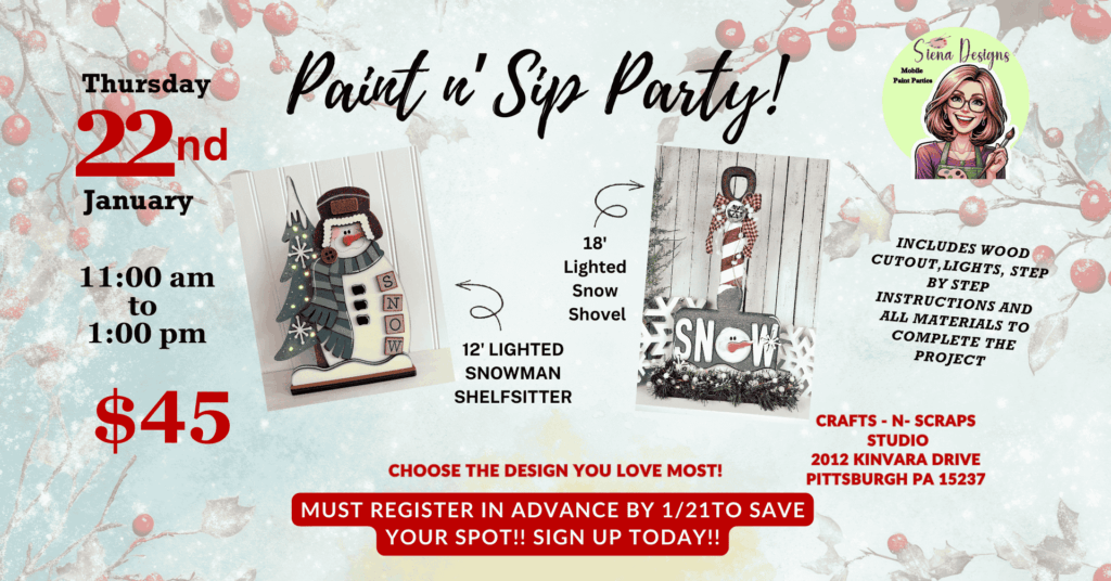 Coming Events January Paint n’ Sip Party January 21st Suncatcher Party Valentine Sea Glass Tree Party January 29th Paint n Sip Click Here to Book Your Own Party With Your Guests