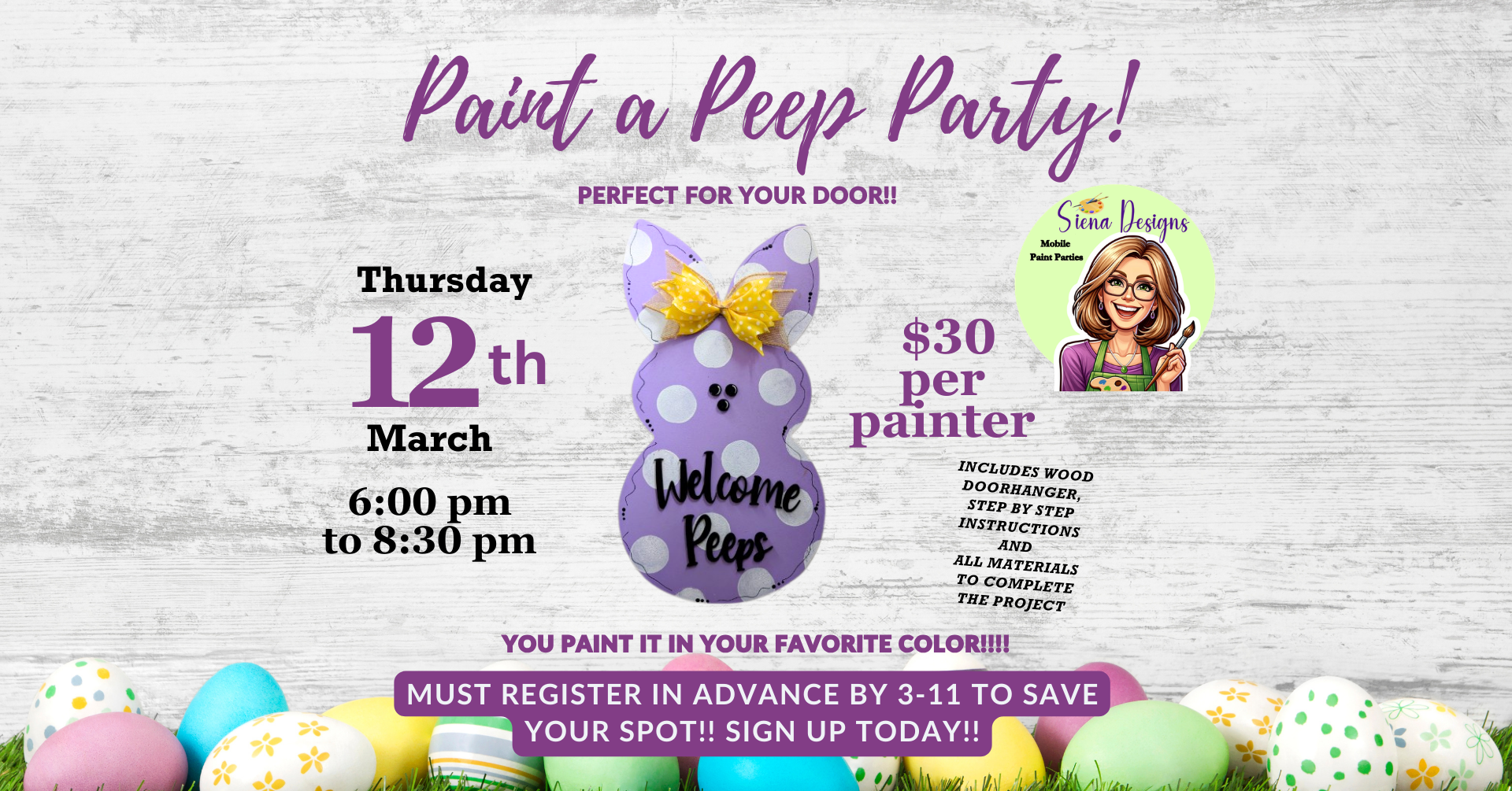 Hop into spring with a fun and creative evening at our Paint a Peep Party! Whether you’re looking to brighten up your front door or just want a relaxing night out with friends, this event is the perfect way to welcome the season.