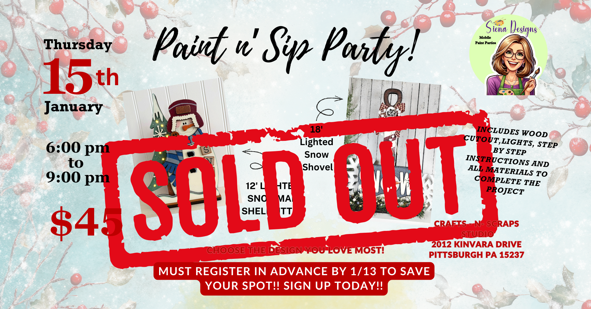 Must pre-register by January 13th!! SEATING IS LIMITED. Grab a friend and come paint with us!