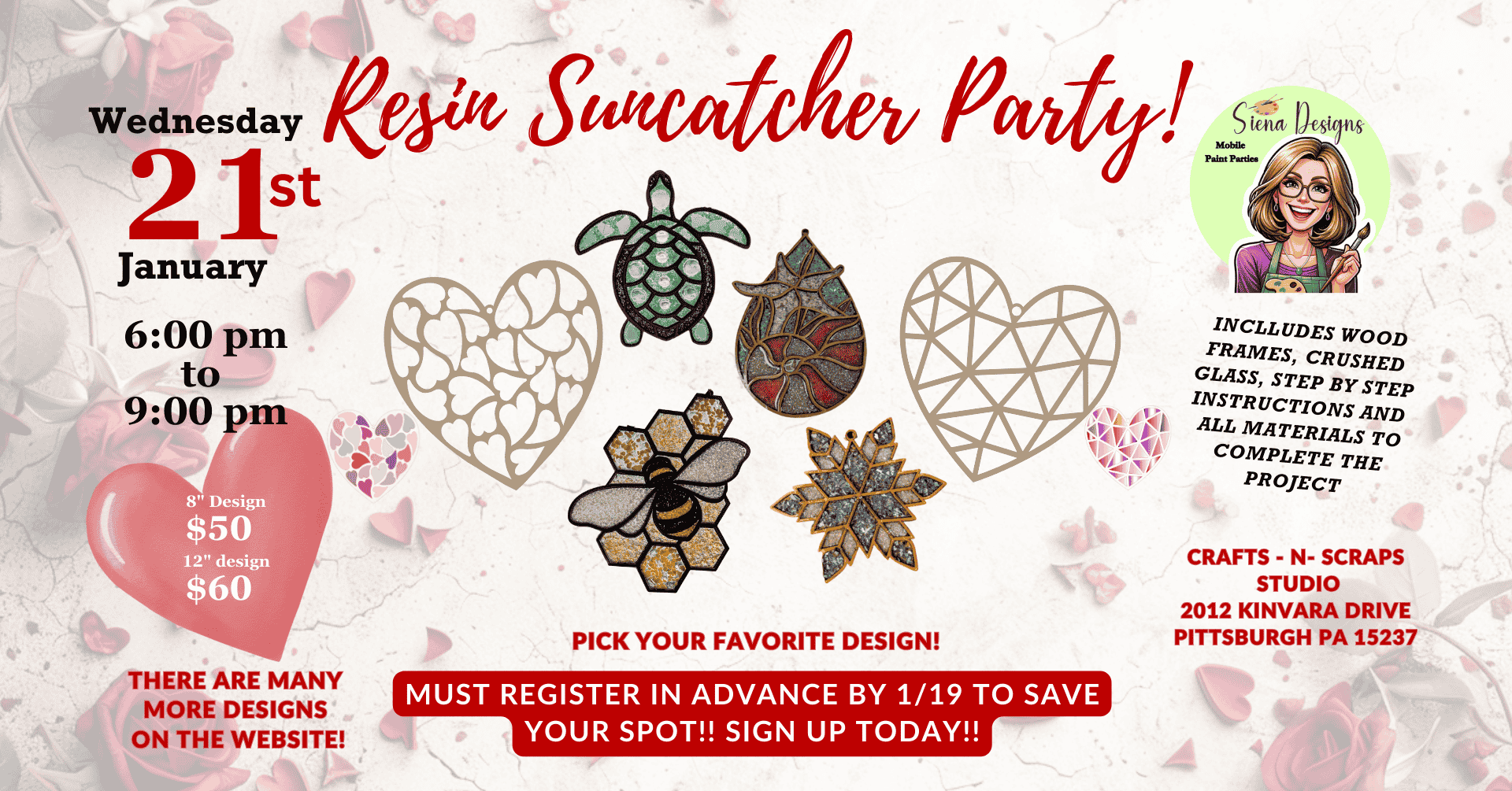CLICK HERE TO SEE ALL THE CHOICES!     Join us at our next class to make suncatchers on January 21st, at 6PM to create your own suncatcher. Valentine themed, Winter, Everyday themed designs like Cardinal,  Sunflowers, Butterfly, Dog Paw or Cat Paw, Horse, 2 different Bunnies, Dragonfly, Turtle, Tulips, Calla Lily, Cancer Ribbon, Daisy and more.  Let your creativity shine and come play with glass and resin! These are so much fun and so easy! Choose your colors and styles from Siena Designs glass bar (crushed, chunked, frit, glitter, marbles and more), place it inside your frame and we will all mix and pour our resin together! All materials and box to transport home are also provided! Don’t delay, quantities are extremely limited.