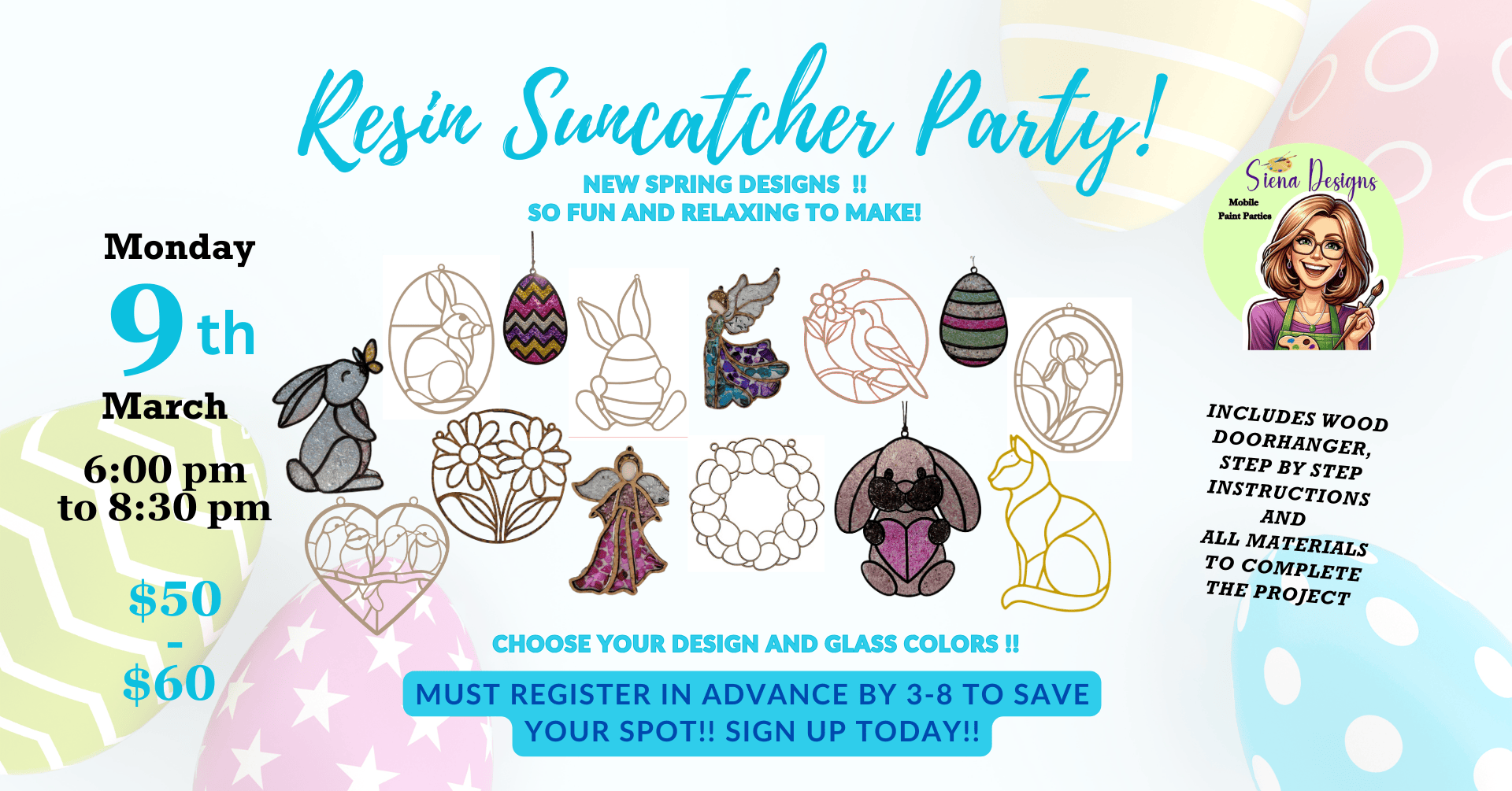 Join us at our next class to make suncatchers on March 9th, at 6PM to create your own suncatcher. Spring themed, Easter, Everyday themed designs like Cardinal, Sunflowers, Butterfly, Dog Paw or Cat Paw, Horse, 2 different Bunnies, Dragonfly, Turtle, Tulips, Calla Lily, Cancer Ribbon, Daisy and more. Let your creativity shine and come play with glass and resin! These are so much fun and so easy! Choose your colors and styles from Siena Designs glass bar (crushed, chunked, frit, glitter, marbles and more), place it inside your frame and we will all mix and pour our resin together! All materials and box to transport home are also provided! Don’t delay, quantities are extremely limited.