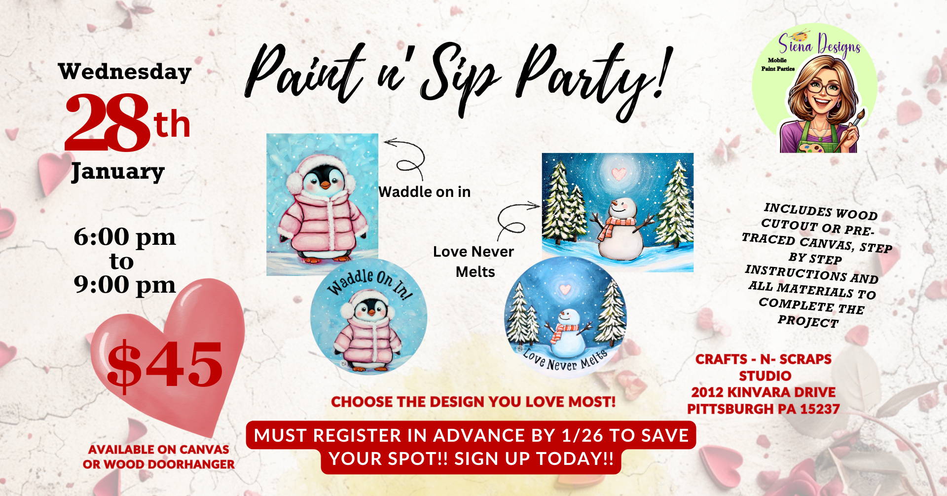 Join us for a fun, cozy Valentine Paint & Sip Night at Crafts-N-Scraps Studio! Choose the winter design you love most and create a beautiful Valentine-inspired piece that proves Love Never Melts ❄️💕